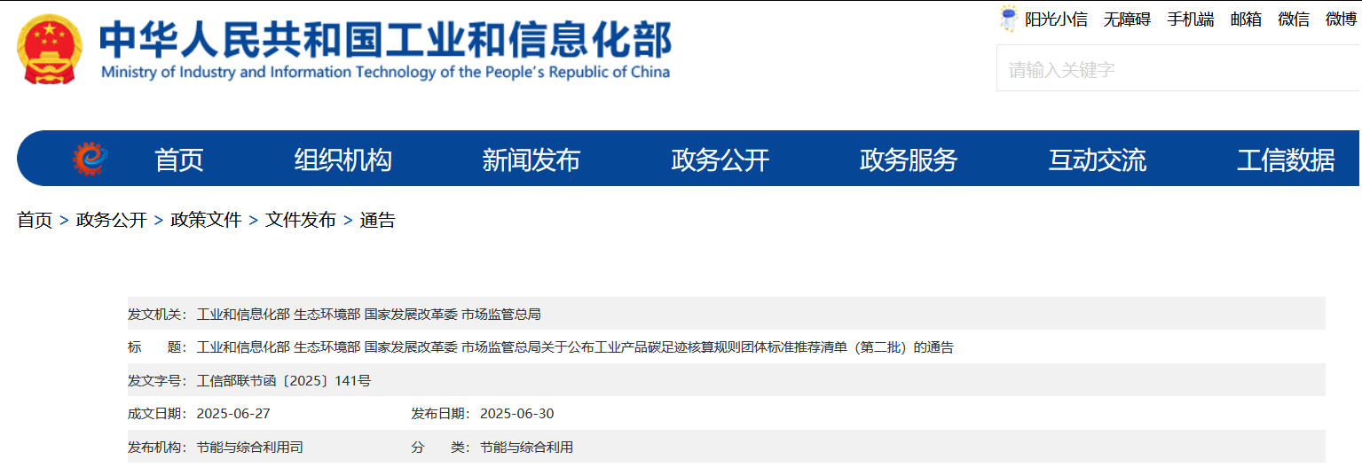 工業(yè)和信息化部等四部門關(guān)于公布工業(yè)產(chǎn)品碳足跡核算規(guī)則團體標準推薦清單(第二批)的通告 詳細>>